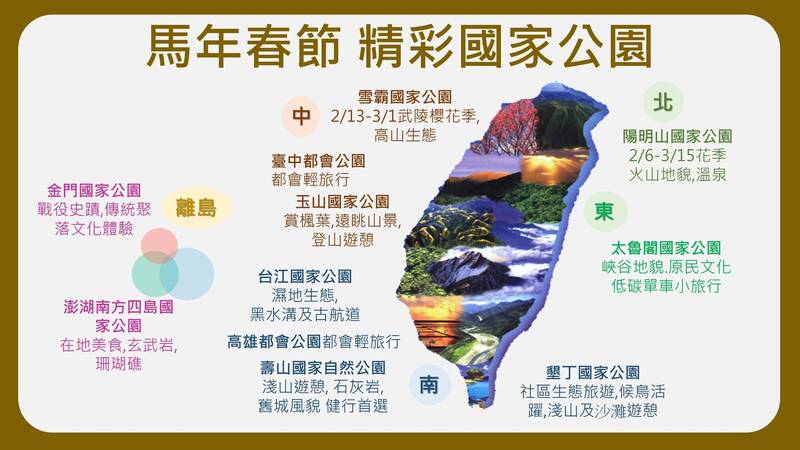 農曆春節將至,內政部今天公布「國家公園陪你迎新春—115年春節特別活動」系列內容,整合玉山、太魯閣、雪霸、金門、台江及國家自然公園等資源,自2月14日至2月27日陸續推出音樂會、文化展演、市集、講座、攝影展及手作體驗等多元活動,邀請民眾春節走春踏青,感受國家公園自然與人文之美。國家公園署長王成機表示,春節期間計畫前往國家公園的民眾,行前建議至各國家公園管理處網站查詢交通管制、展館開放及活動資訊,並優先搭乘大眾交通運輸工具以避開塞車及停車困擾;進入園區時,請務必遵守各項安全指引與保育規範,嚴禁引火、炊煮、採摘花木或隨意丟棄垃圾。