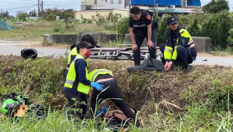 今天下午4時許,台東市豐谷南路與臨海路一段交叉路口發生一起重機與貨車碰撞事故。一名21歲李姓軍人騎乘頗受歡迎的重機「忍者」與貨車相撞,騎士騰飛後重摔、滑行約10公尺遠,所幸人車雙雙落入草叢、傷勢未危及性命。警消接獲通報後火速趕抵現場,發現李男倒臥在下方空地,全身多處擦傷。救護人員立即進行初步檢傷,確認其意識清楚、無生命危險,隨即使用長背板固定,小心翼翼將人抬回路面,再由救護車緊急送醫救治。