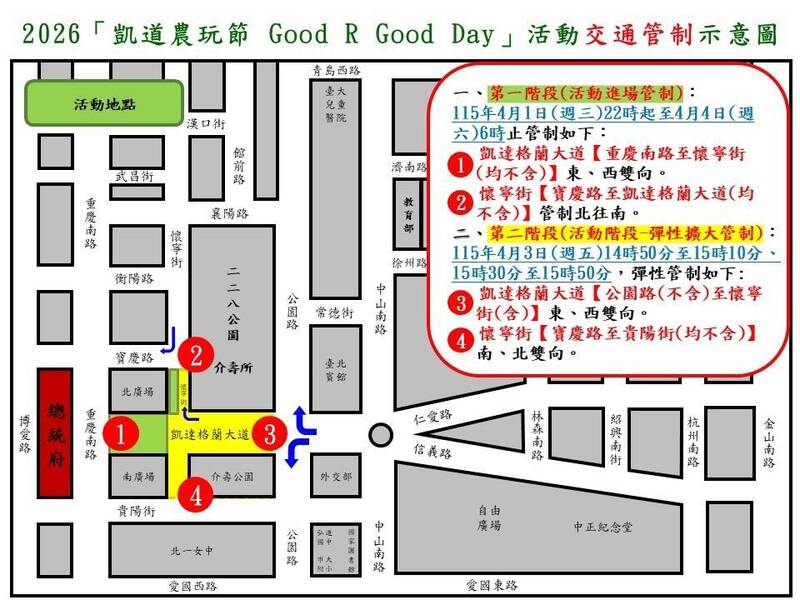 農業部即將在本月3日於總統府前凱達格蘭大道舉辦「凱道農玩節 Good R Good Day」活動,警方預估屆時將吸引大批人潮參與,對此,轄區中正一分局在今天公布相關交通管制措施,也呼籲民眾屆時可多利用大眾運輸交通工具往返,避免塞車。中正一分局說,為了維護這次活動的交通與秩序,相關廠商進場與撤廠作業,警方將在今天晚上10時起,至4日早上6時止,規劃相關交通疏導措施。