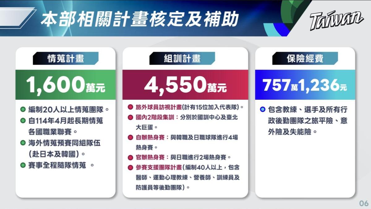 第6屆世界棒球經典賽(WBC)將於3月5日開打,運動部今天表示,為全力備戰WBC,因此延續過往的補助項目,陸續核定補助情蒐計畫新台幣1600萬元、組訓計畫4550萬元及保險費757萬1236元,合計6907萬1236元。