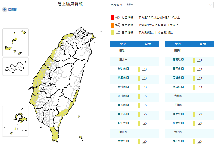 東北風偏強,氣象署今(11日)下午4點28分對新北市、桃園市、新竹市、新竹縣等15縣市發布陸上強風特報。氣象署指出,今傍晚至明晚,新北市、桃園市、新竹市、新竹縣、苗栗縣、台中市、彰化縣、雲林縣、嘉義縣、台南市、高雄市、屏東縣、台東縣(含蘭嶼、綠島)、澎湖縣、連江縣等縣市,有平均風6級以上或陣風8級以上發生的機率(黃色燈號),請注意。