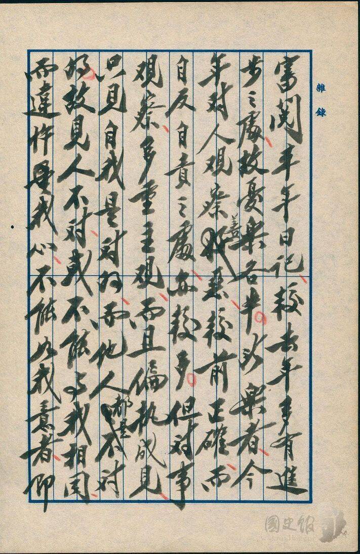 國史館今公開第9批兩蔣日記,揭露兩蔣「交換日記」的特殊互動。蔣介石不僅會審閱蔣經國的日記,甚至曾親筆寫下長達14頁的批示,糾正兒子對陳誠、胡適的心理是「自我主觀作祟」,並建議他閱讀修養書籍《菜根譚》。此後,蔣經國日記的提要欄位改為抄錄《菜根譚》內容,父子之間的微妙互動躍然紙上。根據日記記載,蔣經國1937年自蘇聯回到中國後,在蔣介石要求下開始書寫日記,不僅記錄當下,也會不定時回顧、反省,甚至為了特定目的將日記出版。1955至1957年間的日記顯示,他多次翻閱過往日記自我檢討,1957年9月曾道「回憶近20年前的生活與思想,頗有不堪回首之感」,也自感當時「處事觀人之浮淺幼稚」。因眼疾住院期間,還請人代讀舊日記,9月26日寫道:「在病房中聽宋時選念38年日記」。