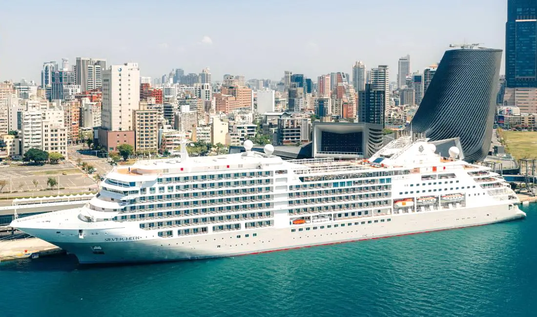 銀海郵輪公司所屬銀海明月號(SILVER MOON)郵輪於今(11)日首航高雄港,高雄港務分公司以象徵歡迎的噴水儀式,迎接銀海明月號郵輪進港,泊靠高雄港旅運中心,讓外籍旅客...