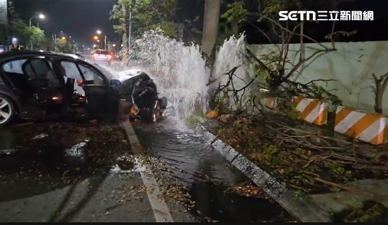 高雄自撞意外!一輛黑色BMW轎車今(27)日晚間9時許行經燕巢區中安路時,因不明原因失控猛力撞擊路邊消防栓,強大撞擊力道不僅導致車頭全毀,更造成消防栓當場斷裂現場一片混亂;警消獲報感到現場,駕駛已失去生命跡象,緊急送醫搶命,詳細事故原因仍待釐清。
