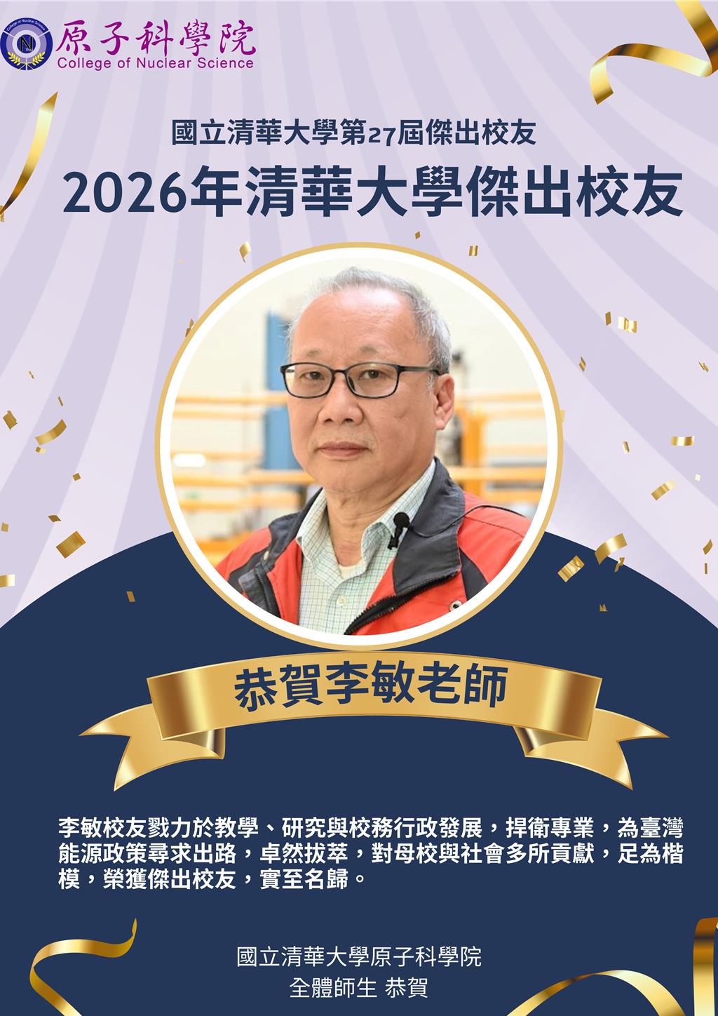 清華大學原子科學院於官網公告,清華大學榮譽退休教授李敏獲選為2026年清大第27屆傑出校友。談及感想,李敏直言,能夠當選的原因,是他發起「以核養綠」公投,展現對社會的貢獻,而清大傑出校友遴選委員會能選出與政