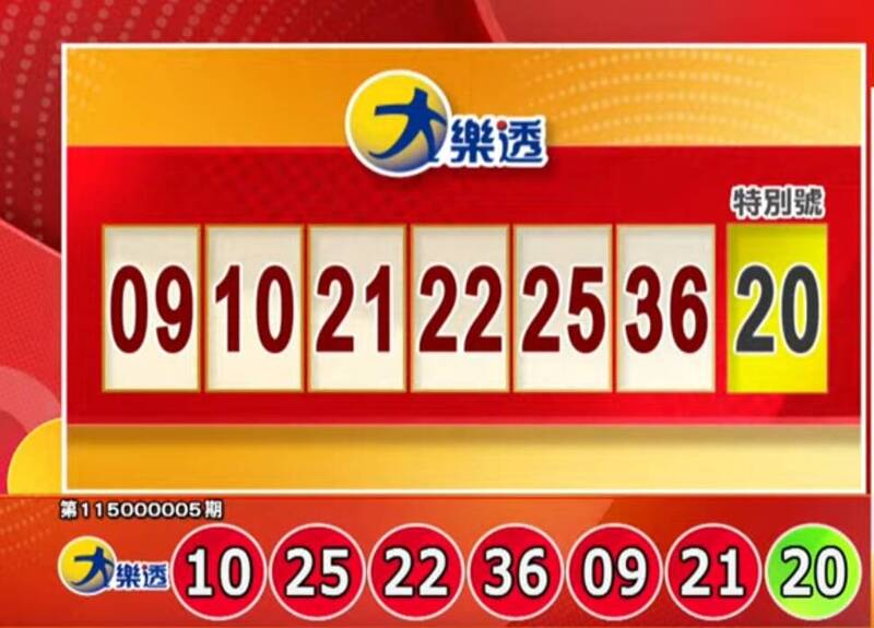 大樂透第115005期今晚開獎。中獎號碼為10、25、22、36、09、21,特別號20。