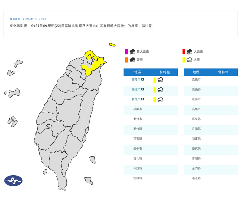 受東北季風影響,氣象署今晚對北北基3縣市發布大雨特報。氣象署今晚9點40分對北北基3縣市發布大雨特報提醒,今晚到明天(22日),基隆北海岸、大台北山區及新北市北海岸、山區有局部大雨發生機率,請注意安全。