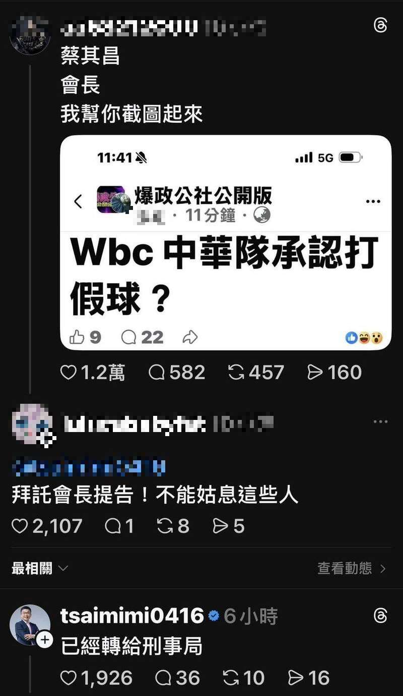 有關網路造謠「中華隊打假球」情形,經中華職棒大聯盟代表至刑事警察局報案後,刑事局四大一隊今天下午1時許將涉案的51歲張姓男子通知到案說明,目前正偵訊中,全案將依社會秩序維護法第63條散佈謠言,足以影響公共之安寧、刑法310條誹謗罪偵辦。警方調查,住在新北市三重區的張男,目前沒有工作,跟父母親同住,持有低收入戶證明,昨天他透過自己臉書的帳號在臉書的爆政公社公開版社群留言「Wbc 中華隊承認打假球?」,引發社會關注與撻伐。
