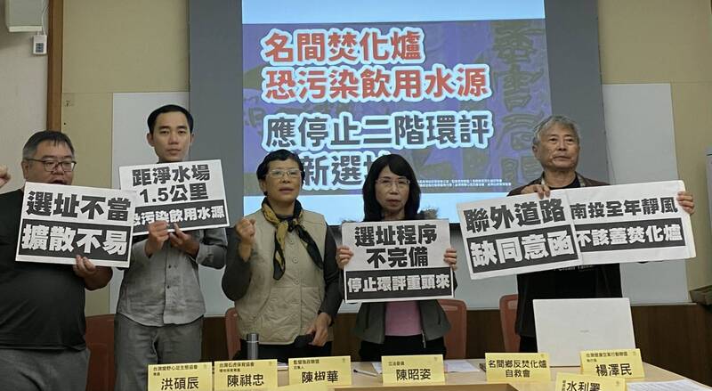 南投縣政府規劃在名間鄉新民村蓋垃圾焚化爐,名間鄉反焚化爐自救會、立法委員陳昭姿、監督施政聯盟與多個環團,今(10日)在立法院召開記者會,認為縣政府選址過程缺乏完整公開及合理比較,且距預定地約1.5公里處有新民淨水場,恐污染飲用水源,要求立即停止二階環評、重新選址。名間鄉焚化爐興建案今年1月31日召開二階環評第一次範疇界定會議,引發地方強烈抗爭,惟縣府3月16日仍將召開第二次範疇界定會議。