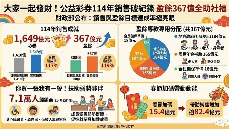 公益彩券114年創下1,649億元銷售歷史新高,遠超預期目標,展現亮眼成績。財政部指出,結算盈餘達367億元,已全數依法專款專用,包括補助國民年金、全民健保及地方社福支出,強化台灣社會福利網。此外,公益彩券更扶助7.1萬名身心障礙者、原住民及低收入單親家庭等弱勢族群穩定就業,實現「善的循環」。115年春節加碼成功帶動逾82億元銷售,未來將持續穩健發展彩券市場,確保社福財源,讓每份愛心精準照顧更多弱勢,實現共好社會。