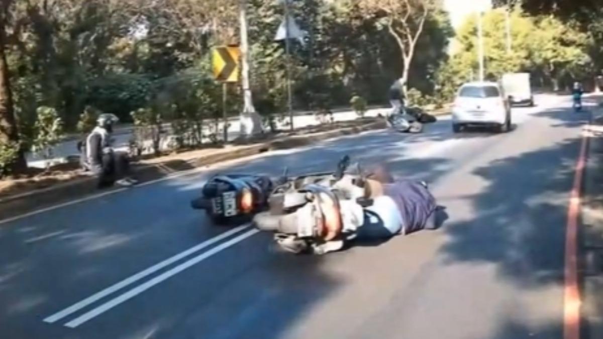 「新竹市」東區寶山路高峰植物園路段1月19日上午發生離奇車禍!一輛貨車油箱蓋脫落,汽油灑漏路面導致溼滑,造成5名機車騎士摔倒、4人受傷送醫,所幸均無生命危險,警方已調閱監視器追查肇事貨車。