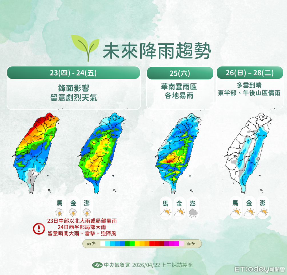 過去一周天氣悶熱,民眾紛紛換上短袖,甚至許多家庭已經提前開冷氣,但即將發生變化。中央氣象署指出,隨著周四、周五(23日、24日)鋒面逐漸通過及東北季風增強,屆時將會降溫並下起大雨。臉書氣象粉專「台灣颱風論
