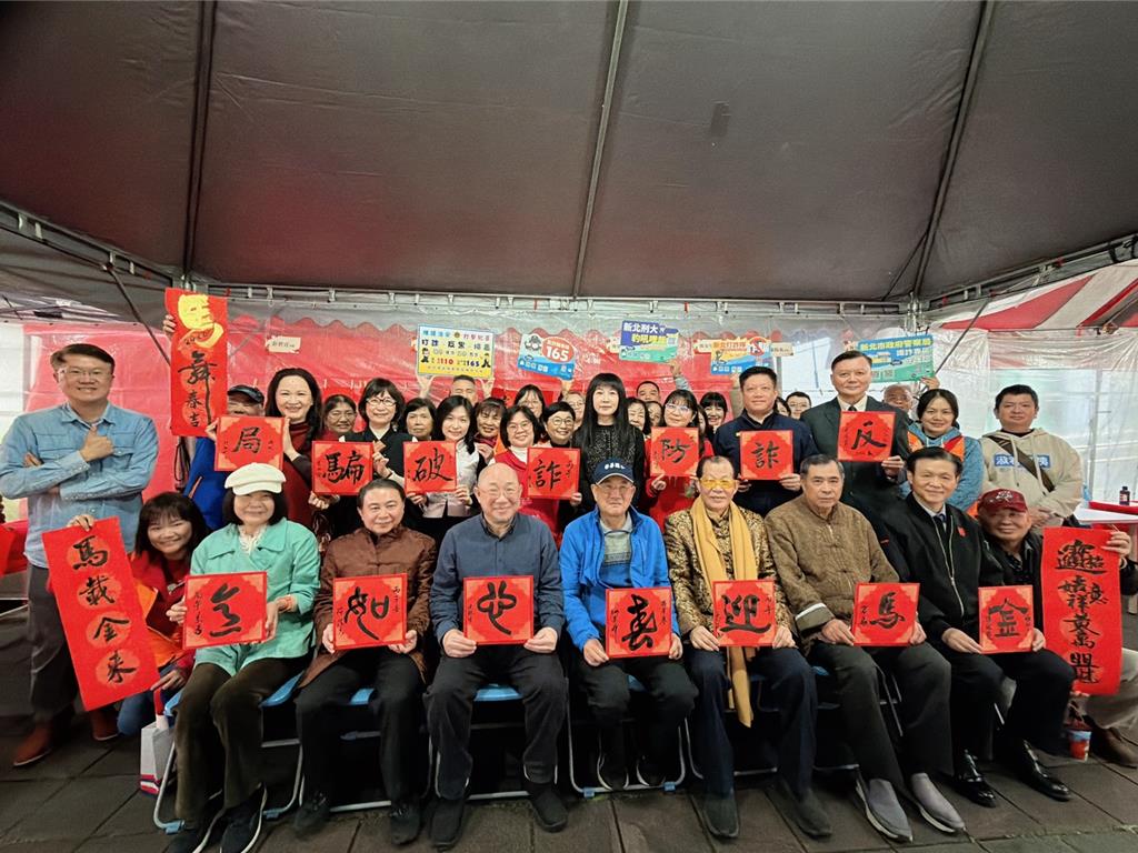 農曆春節將到,新北市議員蔡淑君今天下午在新北市林口警分局前廣場舉辦「和駒納福」春聯揮毫活動,邀請中國書法學會理事長陳銘鏡率領13位書法名家,為民眾揮毫書寫吉祥春聯,結合林口警分局員警進行防詐宣導,另展出已故影帝陳松勇的金馬獎獎座供民眾合影留念,2小時湧入逾千人,將約50坪帳棚擠得水洩不通,現場洋溢年節熱鬧氛圍。「和駒納福」春聯揮毫活動,由人稱「林口阿姨」的蔡淑君、林口警分局長李智源及全國公務人員協會首席顧問陳韋翰共同主辦,除由陳銘鏡領軍外,中國書法學會常務理事郭金堂、諮詢委員蕭陽義等共13位書法名家齊聚,不僅事先準備多款馬年祝福春聯供民眾領取,也應現場需求客製化書寫吉祥祝賀詞,不少民眾一早便到場排隊等候,李智源也下場小試身手,博得民眾掌聲。