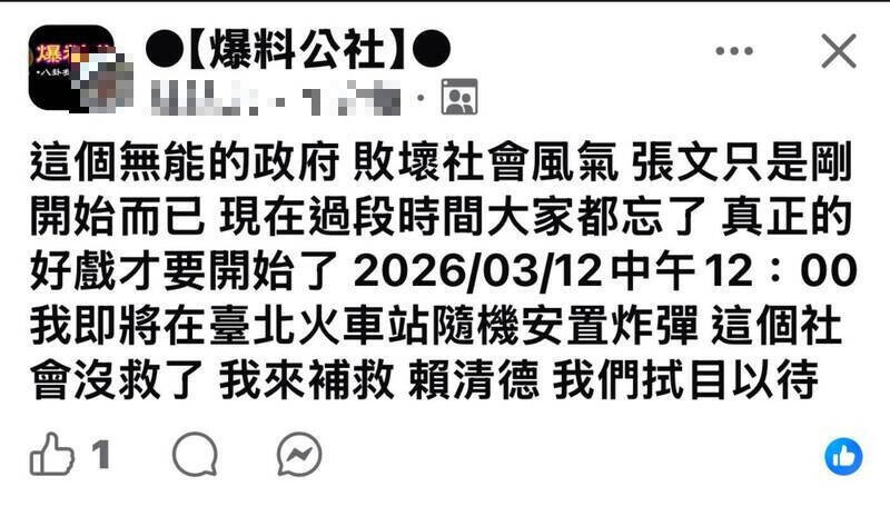 臉書社團「爆料公社」昨日晚間出現一名蘇姓網友的發文,揚言今日中午12時在台北車站隨機放置炸彈。鐵路警察局昨晚獲報隨即展開聯合防禦機制,今日更針對站區展開大規模安檢,員警循線找到蘇姓網友,其家屬喊冤稱帳號被盜,警方已發文通知到案說明。昨日晚間「爆料公社」出現一則發文,蘇姓網友稱「這個無能的政府敗壞社會