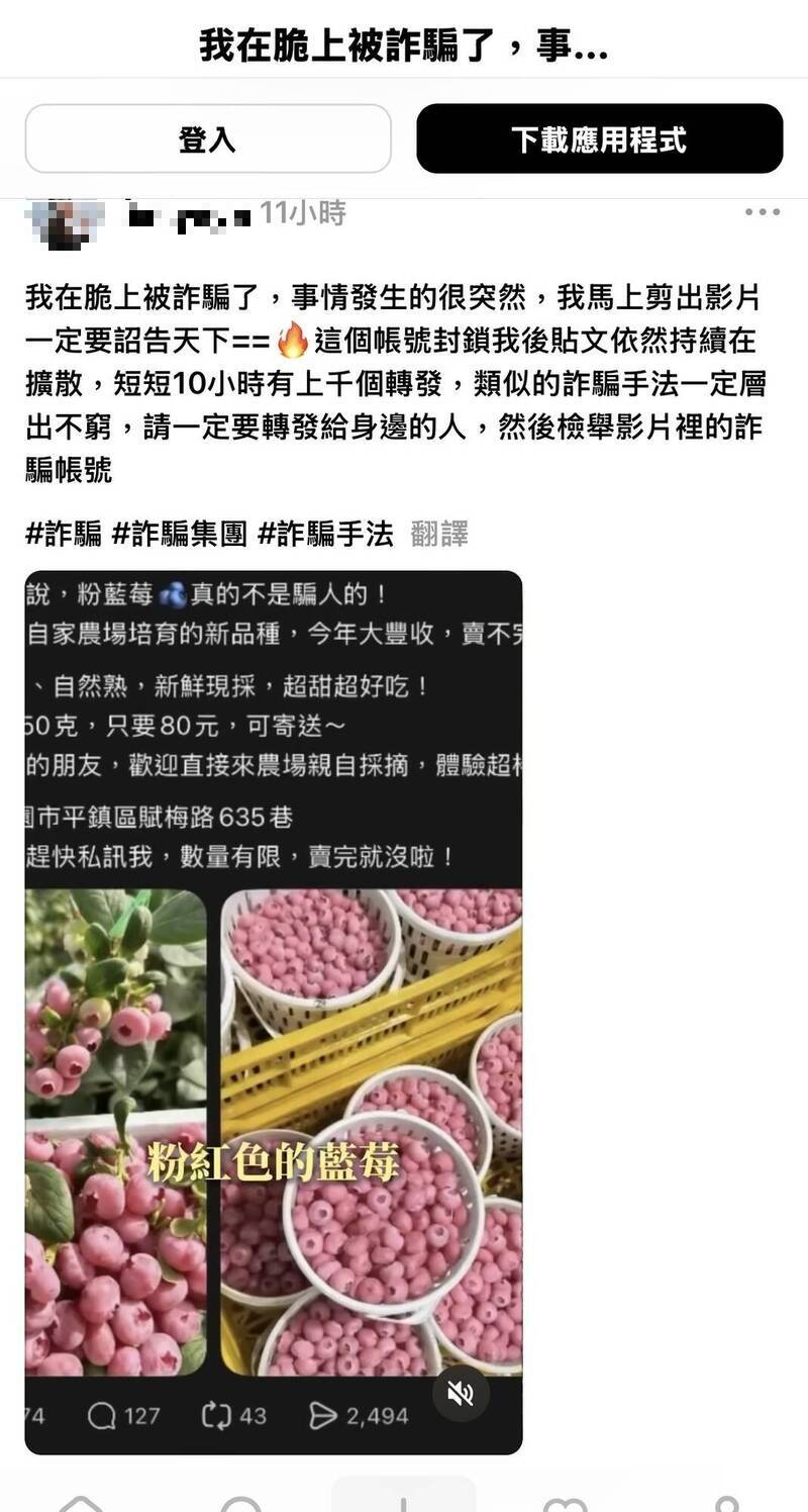 近日網路瘋傳「粉紅藍莓」1盒350公克僅要80元,還標示農場地址為桃園市平鎮區賦梅路635巷,喊話附近民眾可直接前往採摘,吸引不少民眾下單,多位苦主上當受騙後在社群平台Threads上哀號「被騙了,帳戶也被鎖起來。」對此,這家遭冒用資訊的藍莓業者「藍莓果果」除緊急發文澄清、本月初向平鎮警分局報案,黃姓店長今日並出面強調農場沒有販售粉紅色的藍莓,相關貼文都是詐騙,呼籲民眾要認明官網、提高警覺。多名苦主在社群平台Threads留言表示,「這個藍莓一看就很假,怎麼會被騙呢」、「最近家人才遇到,導致銀行帳戶全部被鎖」、「雖然是小額,但很怕帳號被盜用」、「詐騙真的可怕,現在甚至連面交都會被騙」、「好可怕,大家不要被騙」。