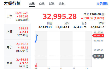 台股呈現「開高強彈大漲」的格局,盤中指數一度大漲883點、突破站上於10日線之上,受美股強勢反彈激勵,台股(9)日氣勢如虹,加權指數終場大漲621點,收在32404.62點,漲幅1.96%,成交量達6308億元。三大法人同步站在買方,合計買超361億元,其中外資單日買超247億元,成為推升盤勢的最大動能。市場解讀,美股道瓊指數首度站上5萬點,成功扭轉先前科技股重挫陰霾,帶動資金回流風險性資產,外資也順勢回補台股權值與金融族群。