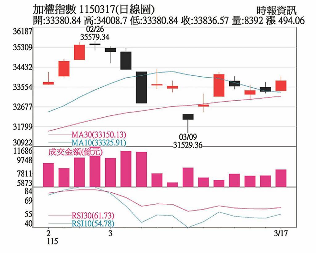 受到美國釋出油價風險降溫訊號影響,美股四大指數全面收紅,帶動亞股同步反彈。美國財政部長貝森特表態不反對油輪通行荷姆茲海峽,加上川普要求北約維護航道安全,使市場對能源供應中斷的疑慮明顯下降,油價回落後資金回流風險性資產,成為今日台股強彈的關鍵推手。台股今(17)日在國際利多激勵下強勢反彈,加權指數終場上漲494.06點,收在33,836.57點,漲幅1.48%,成交金額達8,188.9億元;櫃買指數同步走揚,上漲3.84點至321.03點,漲幅1.21%,成交金額1,951.06億元,呈現量增價揚格局。