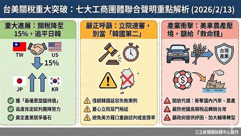 台美正式完成「對等貿易協定(ART)」簽署,總統賴清德今(13日)召開記者會,呼籲立法院儘速審議通過,才符合國人期待。對此國民黨團下午召開記者會提出三大要求,包括,要求行政院說明,是否已完成對全產業的經濟影響評估;政院承諾召開全產業公聽會,讓產學界參與政策討論;行政院提出完整的產業配套措施。說明,行政院盡快送來,立院會很快審查,不會有一絲耽擱。