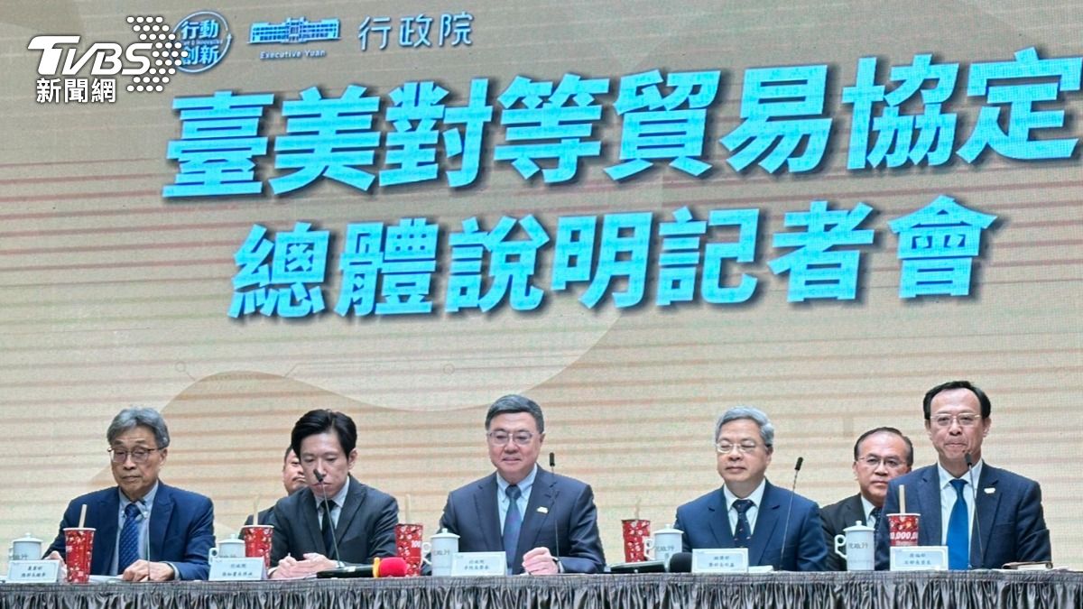 「台美對等貿易協定」正式簽署,行政院13日召開說明記者會,行政院也在13日記者會時特別準備珍奶,秘書長張惇涵在總結時,拿...