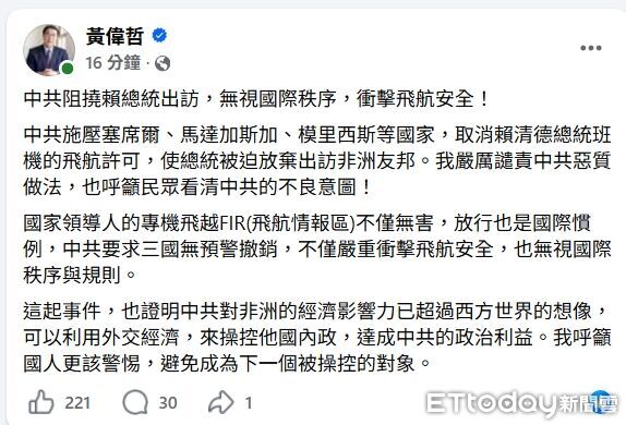 針對中共施壓塞席爾、馬達加斯加及模里西斯等國,導致總統賴清德原訂出訪非洲友邦行程,因專機飛航許可被迫取消,台南市長黃偉哲22日透過臉書及Threads發聲明,表達嚴厲譴責,並呼籲國人正視中共對國際秩序的衝擊。