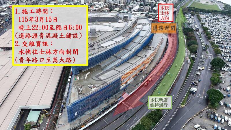 台北市工務局新建工程處今預告,配合「第一果菜及萬大魚類批發市場改建統包工程」施作聯外匝道匯入水源快速道路北向高架車道鋪設瀝青混凝土,3月15日晚上10點至16日清晨6點,封閉水快往士林方向的青年路至萬大路段施工,提醒用路人留意各項告示指標牌面,並依現場義交人員指揮,改道行駛。新工處工務科長高銘伸指出,為紓解市場改建工程完成後周邊道路車流,故在市場主體建物二樓富民路側,新建兩處匝道匯入水快南下及北上車道,未來市場內車輛可由新建匝道沿水快離場,避免車輛集中於萬大路、富民路等主要路口。