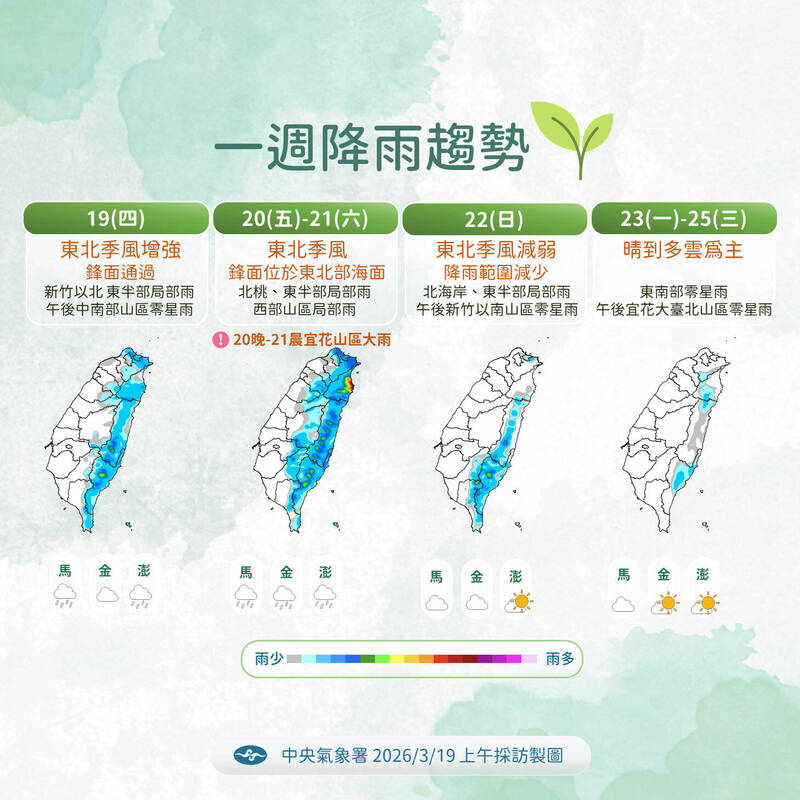中央氣象署表示,明(20)日桃園以北、東半部、恆春半島及新竹苗栗山區仍有局部短暫陣雨,明晚至週六清晨宜蘭、花蓮山區需留意局部大雨。溫度方面,明天北部、東北部及花蓮較涼,高溫22至24度,中南部27至30度,南北溫差大。週日東北季風減弱,降雨趨緩,北部氣溫回升至26至27度。下週四前天氣穩定,各地晴到多雲,但下週五將迎來下一波鋒面及東北季風。