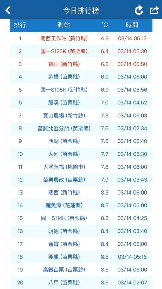 氣象署今天清晨發布苗栗等6縣市低溫特報,平地最低溫為新竹關西7.6度。氣象專家吳德榮說,明天起至19日氣溫逐日緩升,各地...