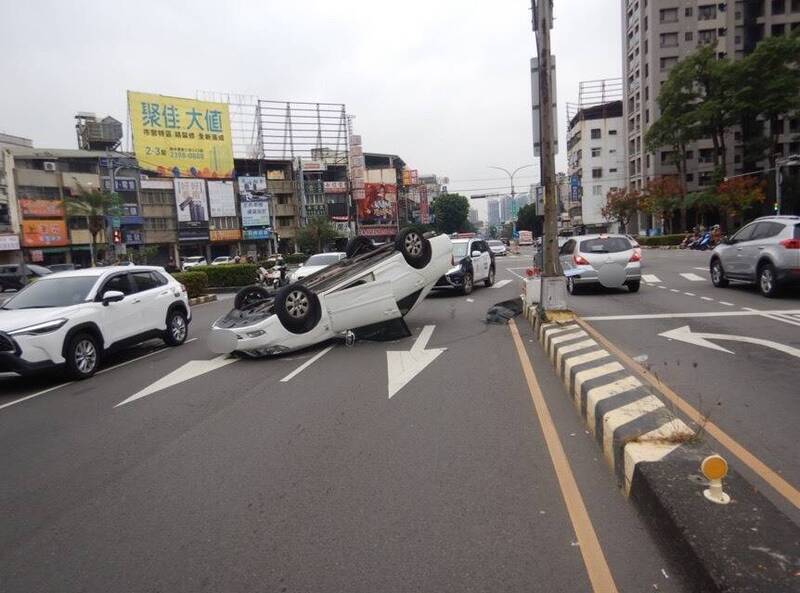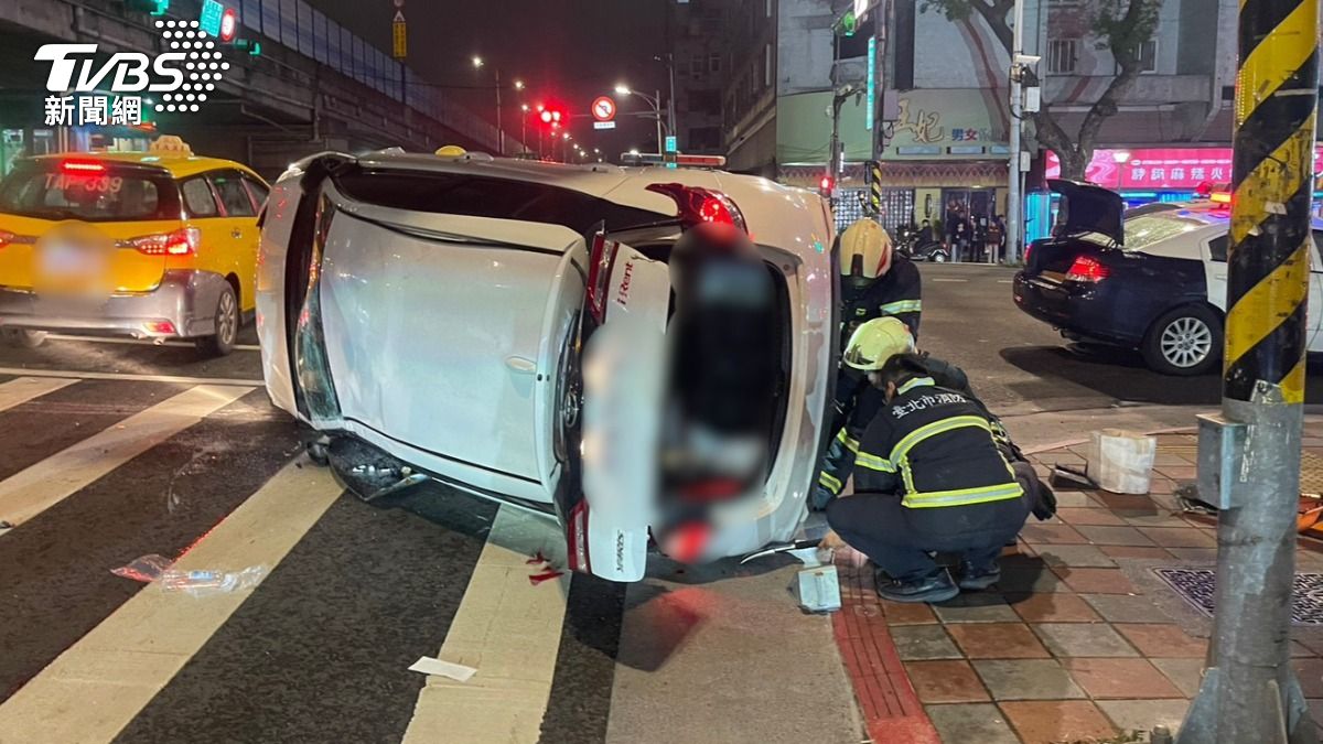 台北市中山區昨(6日)深夜發生轎車翻覆的事件,謝姓男子駕駛的白色租賃車行經新生北路二段與民權東路二段口,疑似操作導航系統分心,車輛突然擦撞內側車道分隔島,接著翻滾一圈半,橫躺至外側車道。警消獲報到場,救出受困駕駛,所幸意識清楚,經實施酒測,酒測值為0,由救護人員送醫治療。