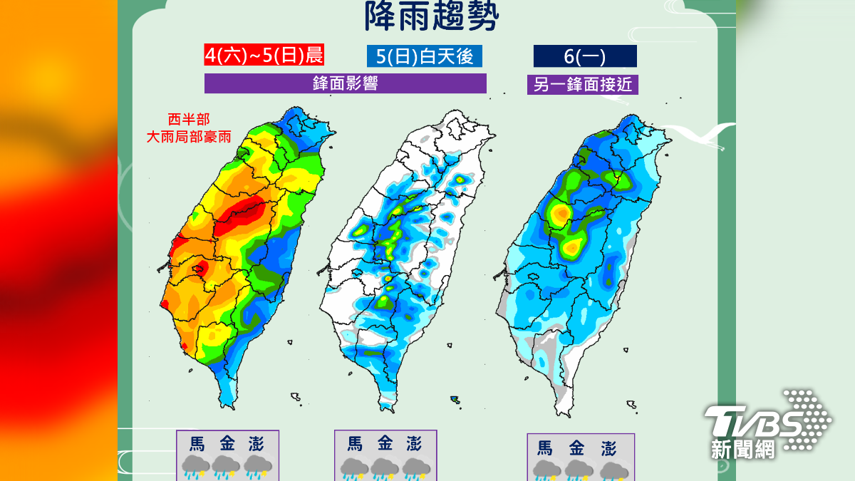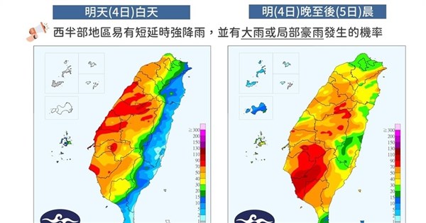 鋒面影響,易有短延時強降雨,中央氣象署發布豪雨特報,今天苗栗縣有局部豪雨或大豪雨,台中市及新竹縣市有局部大雨或豪雨發生,桃園以北有局部大雨發生的機率,注意雷擊及強陣風。