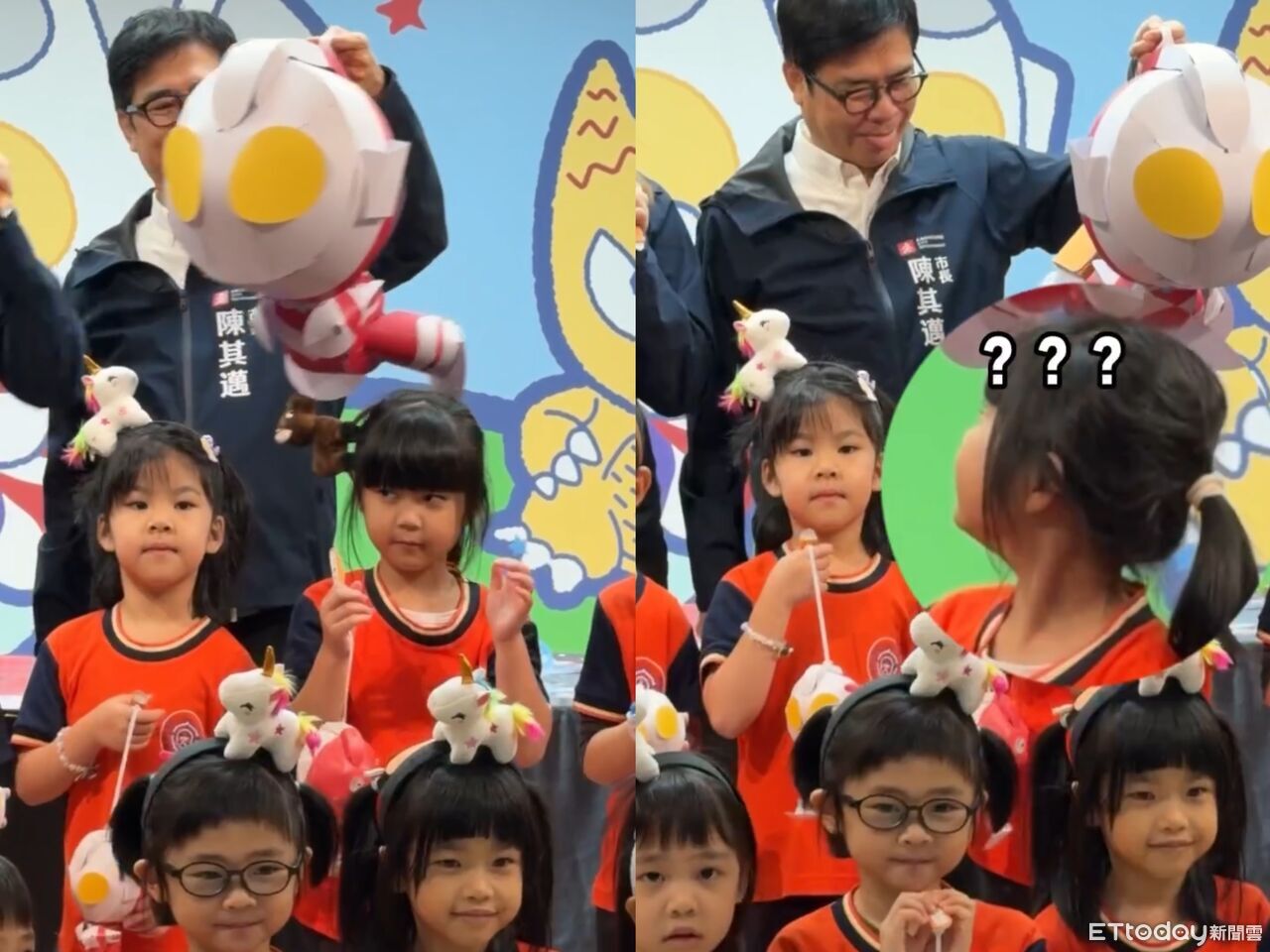 高雄市長陳其邁今(20)日親自開箱馬年新春小物,記者會現場找來幼兒園小朋友一起同歡,而陳其邁拿起《超人力霸王》小提燈後特別興奮,不停拿著提燈展現「超人飛」,不小心將一名幼兒園女童的小馬髮箍撞掉,慘遭小妹妹白眼,他只好俏皮吐舌頭化解尷尬,畫面曝光讓網友全都笑翻。