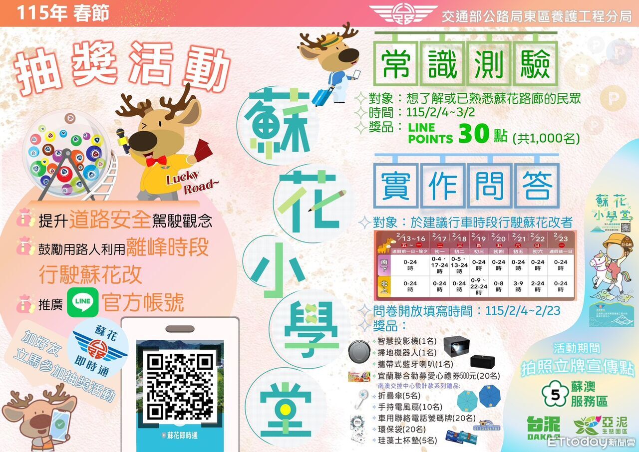 115年春節連續假期自2月14日星期六起至2月22日星期日止共計9天,公路局東區養護工程分局表示,今年春節連假第1天(2/14)及初一至初二(2/17~2/18)將有較大南下車流;北返車潮則集中於初三至初五(2/19~2/21),屆時蘇花路廊、國5各交流道、台9線礁溪北上路段將有車多壅塞情形,建議可改行台9線北宜公路,並多利用國道客運及鐵路公共運輸。