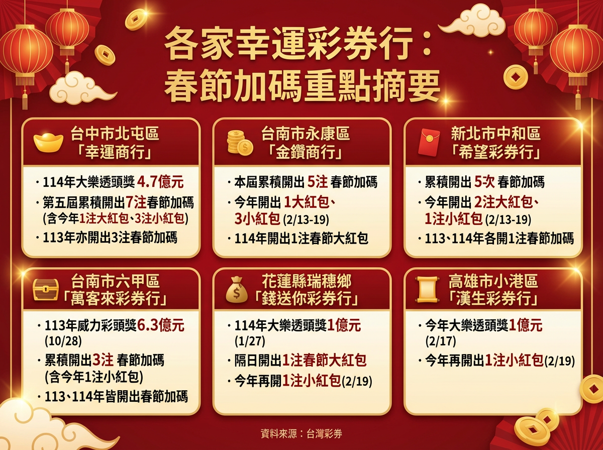 大樂透春節加碼期間,台彩公司20日晚間公布,有多家幸運的彩券行都有超過一次的春節加碼獎項開出紀錄,包括台中市北屯區的「幸運商行」、台南市永康區「金鑽商行」、新北市中和區「希望彩券行」、台南市六甲區的「萬客來彩券行」、花蓮縣瑞穗鄉「錢送你彩券行」以及高雄市小港區的「漢生彩券行」。