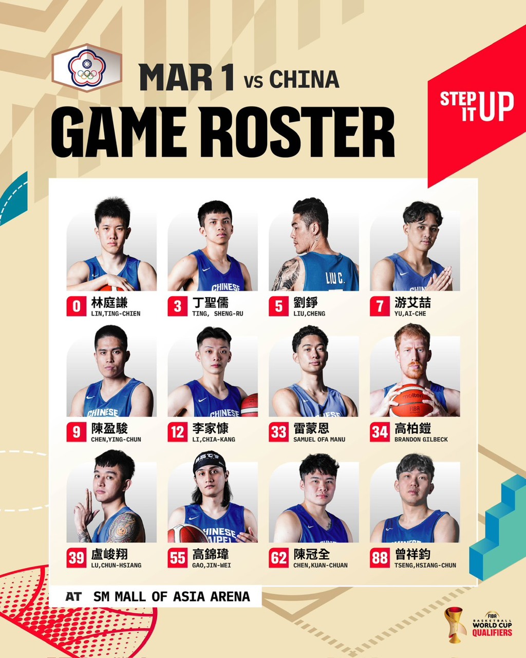 台灣隊3月1日將在世界盃資格賽第2階段於馬尼拉交手中國,28日12人名單確定出爐,由游艾喆頂替受傷的馬建豪。