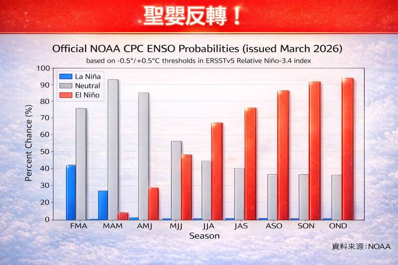 中央氣象署預報,今天(16日)各地早晚天氣較涼,中南部日夜溫差大;各地大多為晴到多雲,僅基隆北海岸、東半部地區、大台北山區及恆春半島有零星短暫雨。國立台灣大學大氣科學博士林得恩指出,今年5月開始,聖嬰現象發生訊號逐月增加,並於10至12月達到巔峰,可能導致強颱比例上升、極端短延時降雨事件增多等現象。林得恩今天在臉書粉專「林老師氣象站」發布貼文稱,美國國家氣象局(NWS)氣象預報中心(CPC)今年3月最新研究顯示,根據目前最新氣候預報模式模擬結果,自去年9月開始的反聖嬰訊號明顯減弱,取而代之的是今年2月所恢復的中性正常特徵,預估將會延續至今年年中。