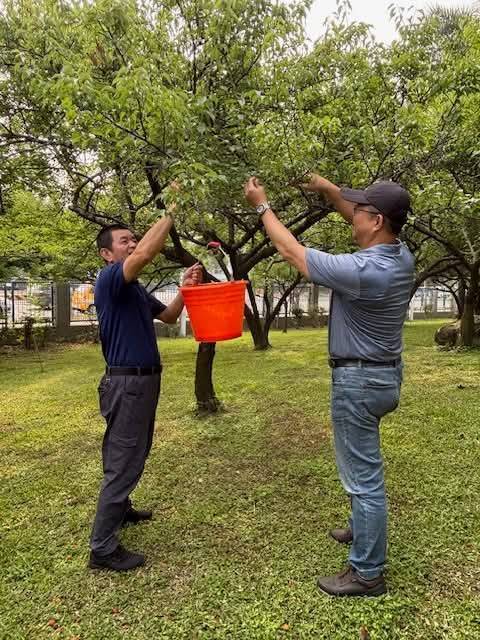 南投縣警察局庭園種植數十棵梅樹,每年梅花綻放後結實累累,讓警局同仁難得暫時放下繁忙公務,帶著妻小等家人前來體驗採梅、製梅樂趣,警局庭園也彷彿成了製梅工坊,大夥採梅、搓梅,合力製成脆梅、Q梅打牙祭或分享親友,現場歡笑聲不斷,也成了同仁季節限定的小確幸。位於南投市南崗二路的南投縣警察局,921地震後移至現址新建辦公大樓,當時的警察局長李福順規劃在面對馬路左側的庭園種植數十棵南投縣樹梅樹,20多年後梅樹蔚然成林,每年入冬梅花怒放,朵朵粉嫩潔白似雪的梅花,將警局染成一片浪漫的雪白世界,讓南投市民不用到信義、水里、國姓及仁愛等山區,即能就近賞梅。