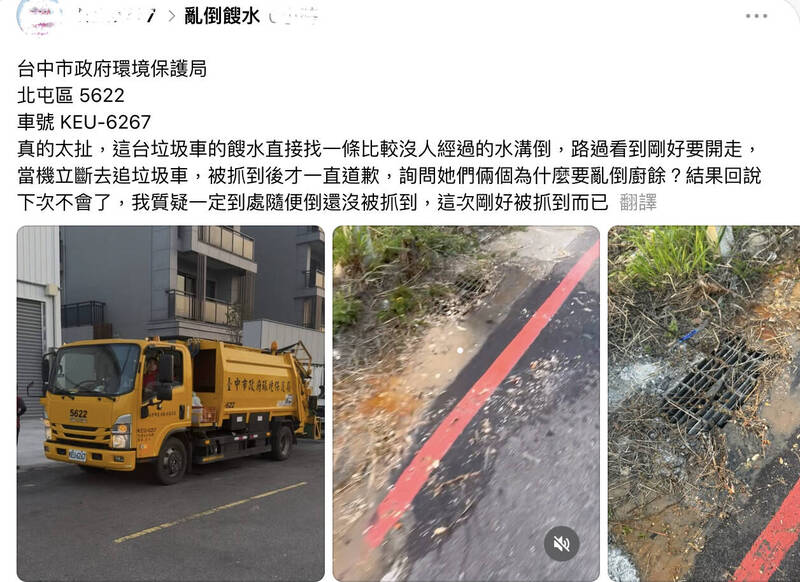 台中市去年爆發非洲豬瘟,引爆全國養豬政策大轉變,引發廚餘大戰,台中廚餘目前仍無有效廚餘去化政策,目前採取隨垃圾送焚化爐焚燒,昨天竟發生環保局垃圾車直接將廚餘倒入路邊排水溝,被民眾目擊拍下檢舉,該車清潔隊員還稱「(廚餘)桶子裝滿不知道怎麼辦,才會找地方處理」,對此,環保局坦承該車疏失,已影響環境衛生,將從嚴、從重處分。民眾路過目擊指出,這輛垃圾車竟然將餿水廚餘,直接偷倒在較無人經過的路邊水溝,留下滿地都是噁心的餿水廚餘,惡臭不堪,他立刻下車拍攝,並追車攔人,對方被攔下後道歉指沿路收運垃圾、廚餘,「從東山路清運到單元十二這區,(廚餘)桶滿了,不知道怎麼辦、才會找地方處理。」