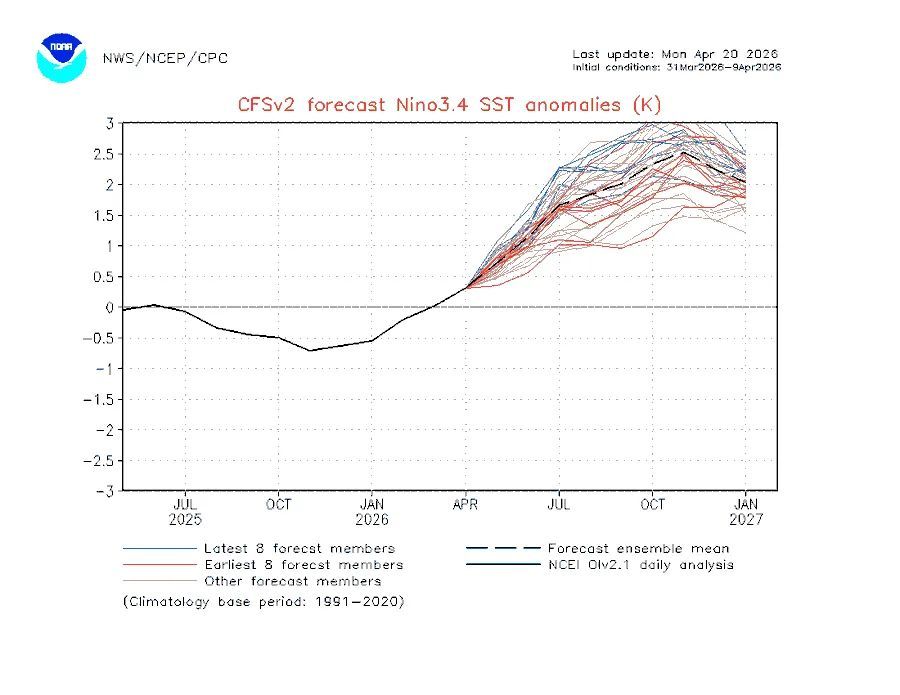 【高沛生/綜合報導】全球海氣系統變化持續受到關注,聖嬰發展訊號再度升溫,美國NOAA最新動力模式顯示,海溫異常已突破強聖嬰門檻,甚至出現超強等級模擬結果。氣象粉專「觀氣象看天氣」指出,多數系集預報已跨越+1.5°C標準,顯示發展趨勢明顯。春季預報不確定性較高,後續強度仍需觀察,但一旦成形,將對颱風生成位置與極端天氣分布造成影響。