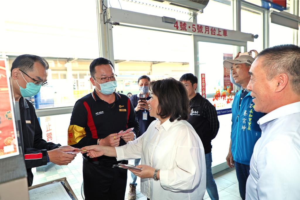 春節9天連假來了,台鐵、高鐵、國道客運、BRT都加開班次輸運旅客,嘉義市長黃敏惠12日率市府團隊至嘉義火車站以及轉運中心視察春節疏運籌備情形,並發放小紅包賀節,同時鼓勵大家多搭乘大眾運輸工具。嘉市府表示,計
