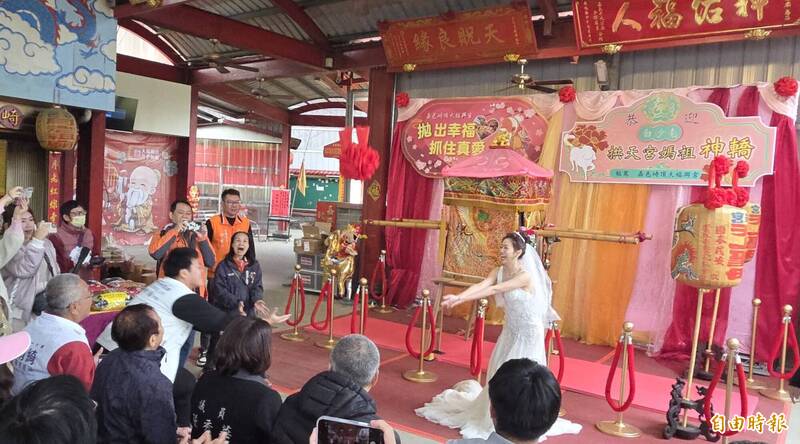西洋情人節與農曆新年將至,嘉義市著名月下老人祖廟崎頂大福興宮迎來白沙屯媽祖「粉紅超跑」駐駕,讓信眾鑽轎腳求平安,2月21日推出「古禮拋繡球徵友徵婚活動」,已吸引200多位未婚男女報名,神似主播蔡尚樺的網紅「柯莉絲汀」今天以一襲白紗禮服登場為活動宣傳,未婚的她也報名活動,鼓勵未婚男女踴躍參與找到好姻緣。宣傳記者會,廟方主委曾東本說,迎接農曆年,推出一系列三大精彩活動,包括白沙屯媽祖「粉紅超跑」自2月14日起至22日接連9天駐駕大福興宮,讓信眾鑽轎腳祈求平安,現場還進行摸彩;2月13日至21日舉行「新春好運到擲筊納好年」獎品豐富;2月21日推出浪漫「古禮拋繡球徵友徵婚活動」,對象為22歲至45歲未婚男女,即日起至19日止免費報名。