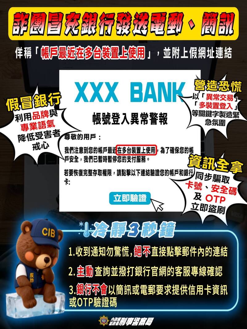 詐騙集團過年也不打烊,冒用銀行名義發送電子郵件給予不特定對象,內容佯稱「帳戶最近在多台裝置上使用」,危害其帳戶安全為由,並附上偽冒網址連結,緊抓民眾深怕農曆年節帳戶無法使用的心理憂慮,誘導輸入信用卡資料及一次性驗證碼(OTP),導致信用卡立即遭盜刷;刑事警察局統計,農曆連假期間共有18人受騙、財損近80萬元。刑事局表示,詐團利用本月14日至22日的過年期間,冒用銀行名義到處發送一則電子郵件,內容為「尊敬的用戶:我們注意到您的帳戶最近在多台裝置上使用,為了確保您的帳戶安全,我們已暫時暫停您的支付服務,若要恢復完整存取權限,請點擊以下連結,驗證您的帳戶與銀行卡...」,並附上偽冒網址連結。