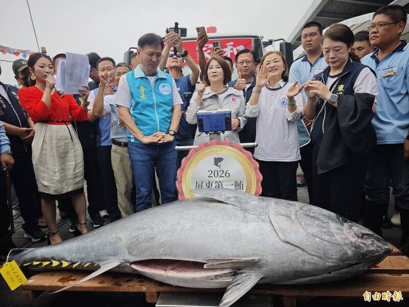 台灣黑鮪魚汛期已經開始,全台漁民盡全力捕捉的「第一鮪」今天在屏東東港舉行拍賣會,經過多輪競標,重達190公斤公黑鮪在縣長周春米最後一鎚定音下,以每公斤10600元拍出,由當地極具知名度的佳珍海產餐廳及澎坊股份有限公司合力標下,為屏東第一鮪再創新高。2026年屏東第一鮪拍賣會「馬上鮪大」,今天活動重頭戲的拍賣流程在中午登場,釣得「第一鮪」的琉球籍漁船「富漁慶2號」,在海巡艦的戒護下開進港邊,沿岸鞭炮隆隆聲中,共同迎接今年第一鮪漁船入港,當第一鮪吊出船艙時,碩大身軀引來全場驚呼,縣長周春米、農業部政務次長黃昭欽、漁業署署長王茂城、美國在台協會(AIT)高雄分處處長張子霖、日本台灣交流協會高雄事務所所長奧正史等,共同登船為今年屏東第一鮪加冕掛牌。