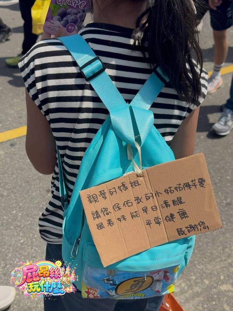 北市警中正一分局女警陳芊雯日前產下一女後,因失血過多不幸猝逝。一名活動攝影師4月19日在白沙屯媽祖徒步進香回到通霄那天,遇到疑似陳芊雯姪女,揹著請求媽祖保佑陳芊雯早日清醒的紙牌。她將當天照片PO出後,讓網友看得相當揪心。台北市警中正一分局36歲女警陳芊雯,在4月18日迎來女兒誕生,但是她卻在生產後因失血過多,經急救一天後,於4月20日凌晨不幸離世,甚至來不及見女兒一面。消息一出,同僚感到相當震驚,也私下發起募捐,希望能照顧陳芊雯的家庭。