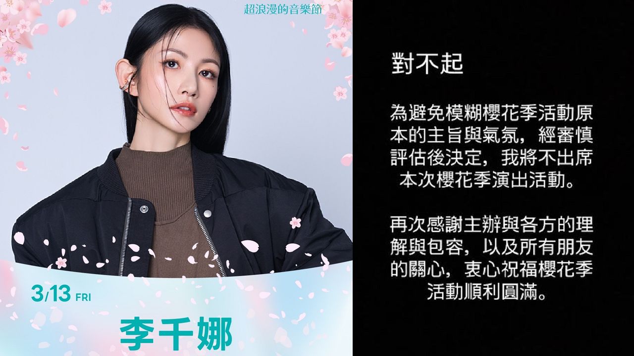 受到電影《世紀血案》相關爭議延燒影響,歌手李千娜今(8)日透過IG限時動態宣布,決定退出原訂參與的櫻花季演出活動。她以黑底白字發文致歉,表示經過審慎評估後,為避免模糊櫻花季活動原本的主旨與氣氛,因此選擇不出席此次演出。