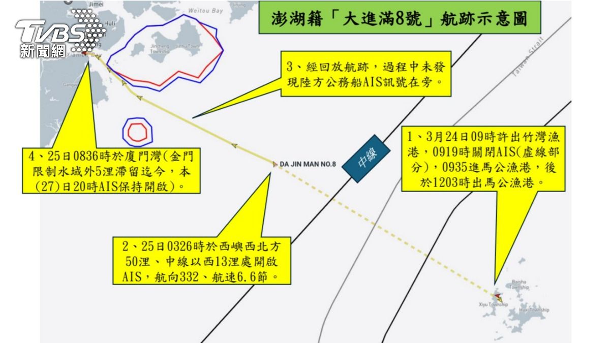 澎湖籍漁船「大進滿8號」日前因疑似在中國沿海從事非法販售漁船用油,遭中國海警船查扣,「大」船在3月23日從澎湖馬公漁港出發,載有3名台籍及4名印尼籍船員,隨後關閉AIS系統,25日凌晨在澎湖西北方50浬開啟AIS並航向中國廈門,最終停泊於廈門灣漳州港,目前船主及家屬均表示不清楚狀況,海巡署正積極查詢船隻動態並提供協助。