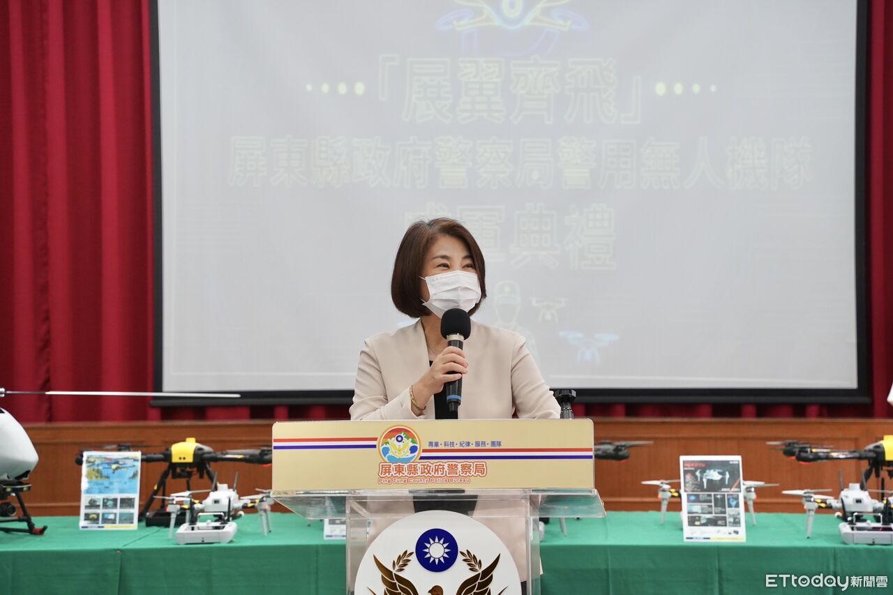 屏東縣警局今成立警用無人機隊,縣長周春米到場授旗,周春米今致詞提到,很多外縣市作奸犯科逃到屏東,躲山裡或從海出去,治安維護更顯重要。