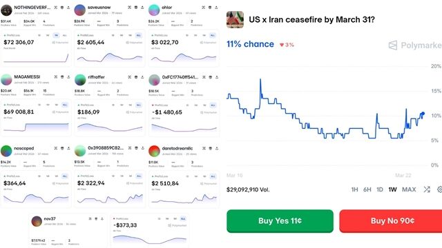 加密貨幣預測市場平台Polymarket一名神秘玩家2月底成功預測美國空襲伊朗的時間點,從2筆小額投注中獲利8.5萬美元(約新台幣272萬元),被懷疑掌握內線消息的他如今再度出手,豪擲4萬美元(約新台幣128萬元)押注美伊將在本月底前達成停火協議。