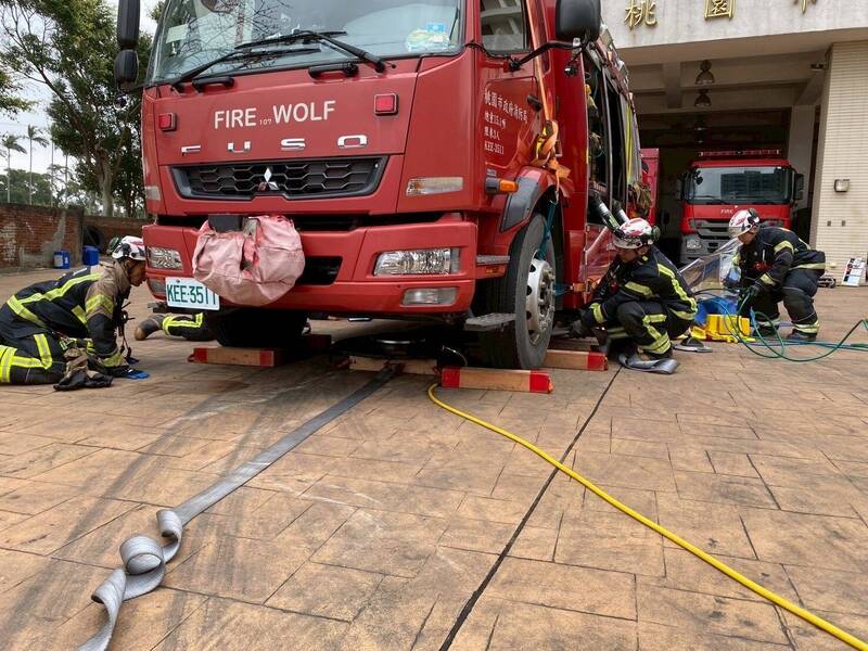 桃園市政府消防局特搜大隊今天在楊梅區埔心分隊前廣場,舉辦「車禍重型救援組合演練」,模擬大貨車與行人發生碰撞後造成行人被壓在車底的意外,逼真演練「限制位移」、「創造支點」、「建立頂昇」、「跟隨負載」、「鎖固後救援」、「處理側向力」等核心技術。演練由特搜大隊主辦,結合第2大隊埔心分隊共同參與,消防隊員們在模擬真實事故現場,演練「限制位移」等技術,以確保施救過程穩定,並創造出足夠的救援空間,助被壓在車底的行人脫困。