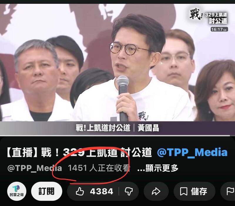 前台北市長柯文哲涉京華城貪污等弊案,被判17年有期徒刑、褫奪公權6年,民眾黨號召全國小草今(29)日上凱道聲援「阿北」。活動開始近3小時,民眾黨對外聲稱現場超過8萬人、線上觀看突破10萬人,不過歌手徐小花發文揭露,民眾黨官方YouTube頻道直播人數僅有「1450+1人」,消息一出,迅速引發熱烈論。據悉,民眾黨今日下午在凱道舉辦的「戰!329上凱道討公道」抗議活動,有在民眾黨官方YouTube「民眾之聲」打開實況直播,活動主持人在現場高喊,現場力挺人數破8萬人,同時,線上也有逾10萬人觀看活動力挺阿北。對於主持人說法,徐小花發文曬出她正在觀看的民眾之聲直播截圖,上面顯示正在收看總人數為1451人,並未破萬。