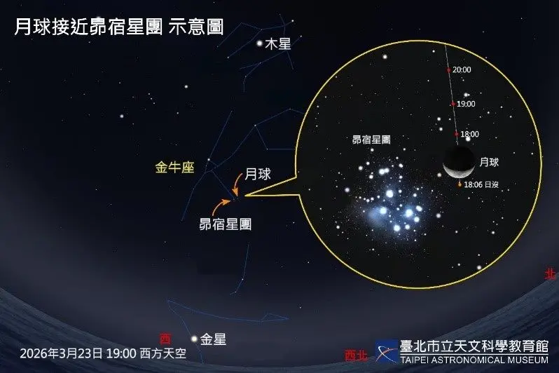 春季夜晚精彩天象要來了!根據臺北市立天文科學教育館表示,下週將會有一連串月球與多個亮眼星體近距離接近的天象美景,分別是下周一(23日)、下周四(26日)、下周五...
