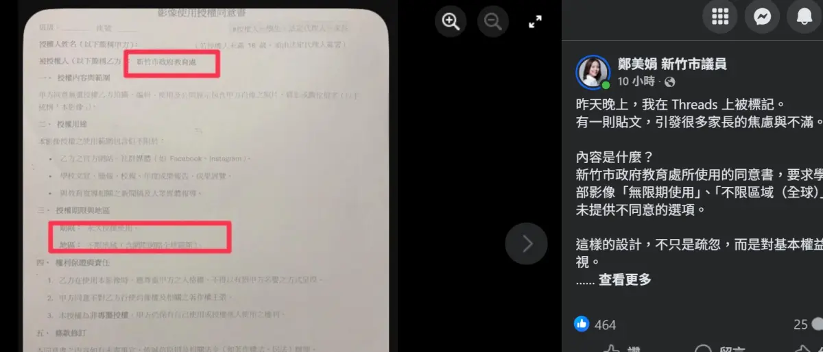 新竹市政府教育處遭爆,使用同意書要求學生臉部影像「無限期使用」,且是「不限區域」。新竹東門國小則發布聲明,提到內容說明未臻清楚,造成部分家長疑慮,為此致上歉...